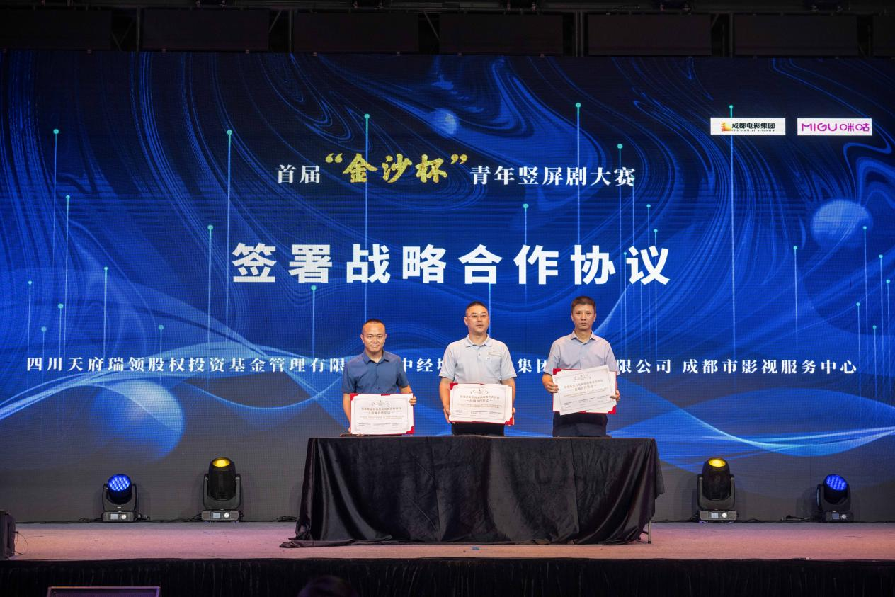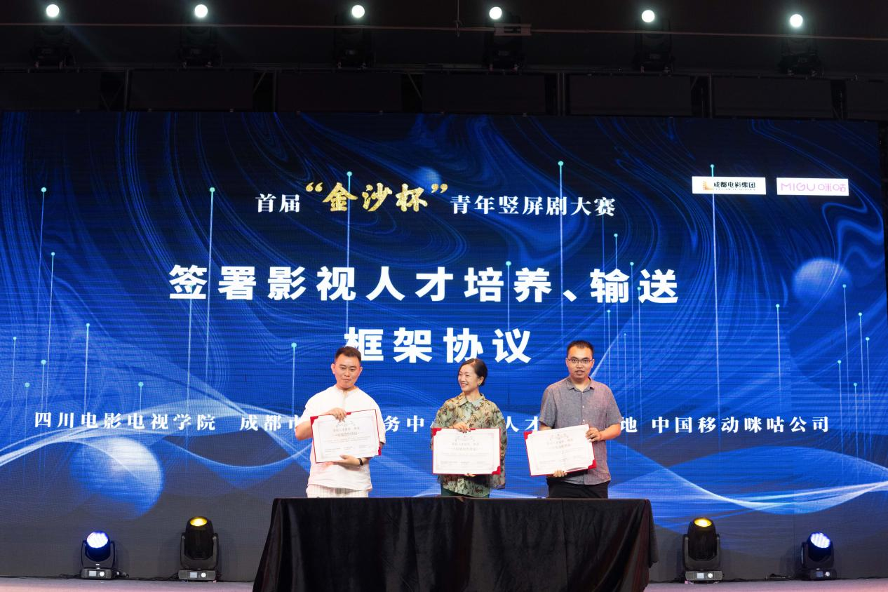 中國移動咪咕公司咕咕工作室短劇制片人黃振民 (左)、四川電影電視學院黨委副書記、副校長羅思(中)、成都市影視服務中心人才孵化基地負責人張易(右)簽署影視人才培養(yǎng)、輸送框架合作協(xié)議