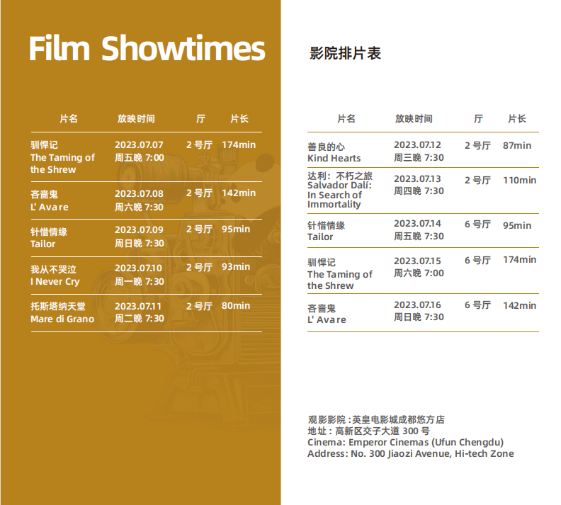 本次電影周選取的影片極具代表性。紀(jì)錄片《達(dá)利:不朽之旅》講述了西班牙超現(xiàn)實(shí)主義藝術(shù)家薩爾瓦多·達(dá)利的傳奇一生與傳世畫(huà)作;取材于英國(guó)杰出戲劇家莎士比亞最具“冒犯性”劇本的戲劇片《馴悍記》,在全片“笑果”不斷的同時(shí),也用“以古現(xiàn)今”的方式引發(fā)觀眾對(duì)當(dāng)下的思考;取材于法國(guó)著名劇作家莫里哀代表作的戲劇片《吝嗇鬼》,生動(dòng)描繪了世界文學(xué)史上“四大吝嗇鬼”之一“阿巴貢”的形象;精彩呈現(xiàn)意大利風(fēng)光的《托斯塔納天堂》將跟隨一群兒童冒險(xiǎn)家漫游到意大利托斯塔納……